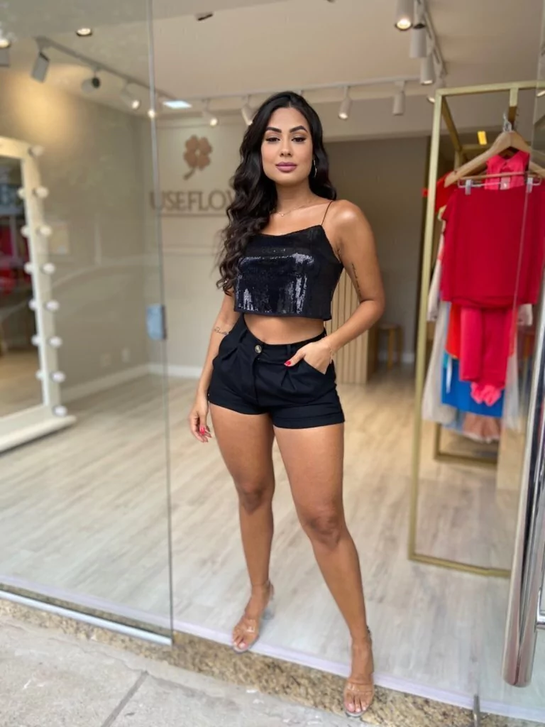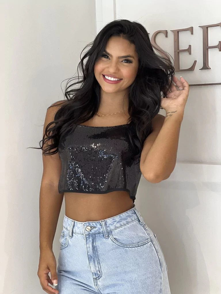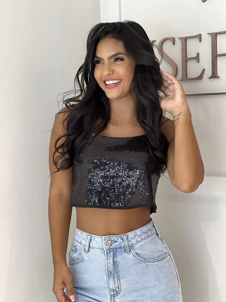 Top Cropped de paetê bordado em tecido de malha que tem elasticidade e aumenta o conforto e usabilidade da peça. Possui acabamentos em forro e alça de elástico fino da cor da peça. Combina com tudo e fica maravilhoso especialmente com peças de cintura alta. MUST HAVE dessa estação, nossa peça favorita! *Modelo usou PP. Tabela de Medidas PP – Busto 84cm | Comprimento 25cm P – Busto 88cm | Comprimento 26cm M – Busto 92cm | Comprimento 27cm G – Busto 96cm | Comprimento 28cm