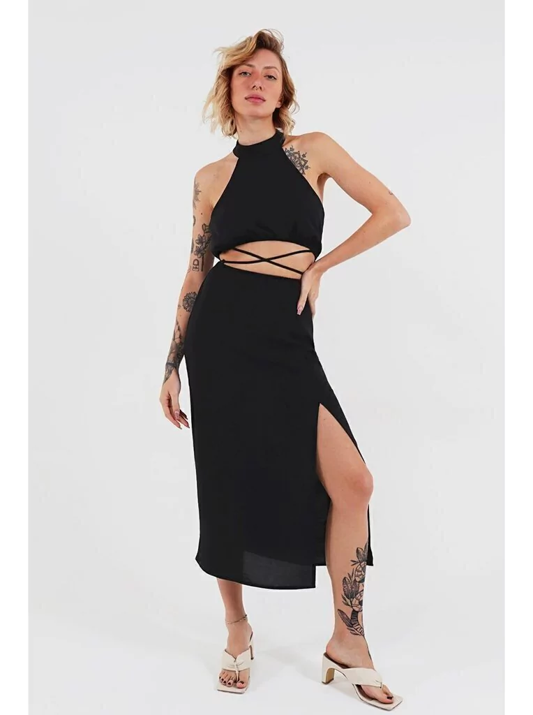 Vestido em crepe Antonella mídi de gola com recorte vazado e amarração na cintura e fenda nas costas. Composição 100% poliéster Forro: 100% poliéster