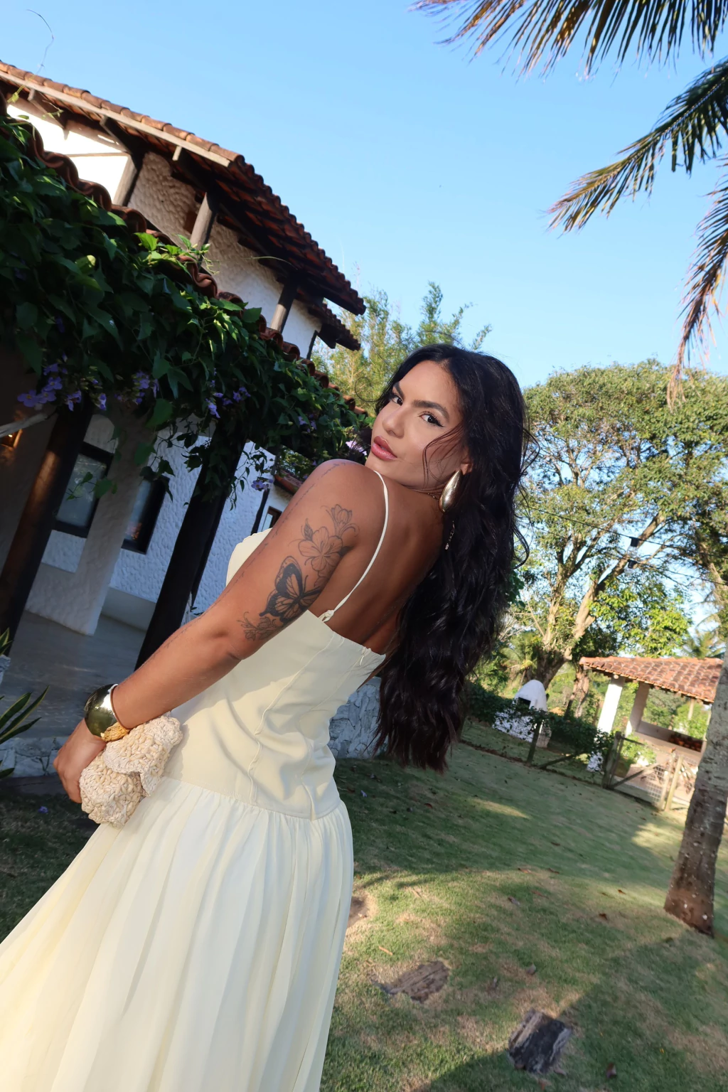 Detalhes que fazem a diferença: - Decote reto que valoriza o colo. - Saia franzida com leve transparência, acrescentando um toque de charme. - Zíper invisível para um ajuste impecável.