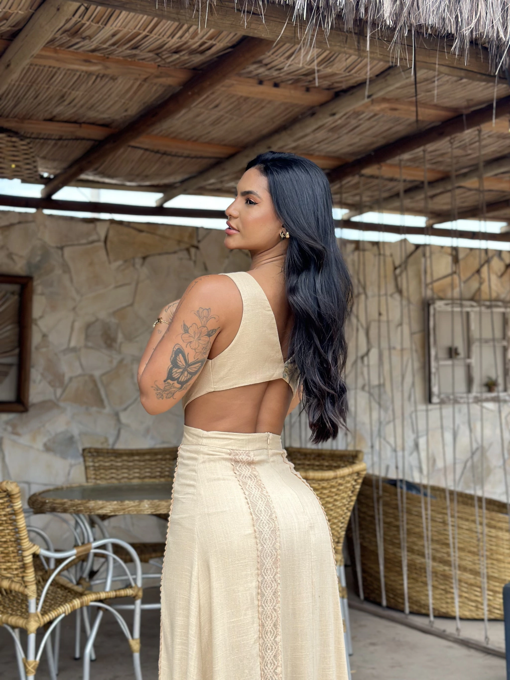 Desperte olhares com o Vestido Longo Fluido em Linho, a escolha ideal para quem valoriza sofisticação e conforto. Com recortes laterais e detalhes em renda na saia, ele se adapta perfeitamente a diversas ocasiões.