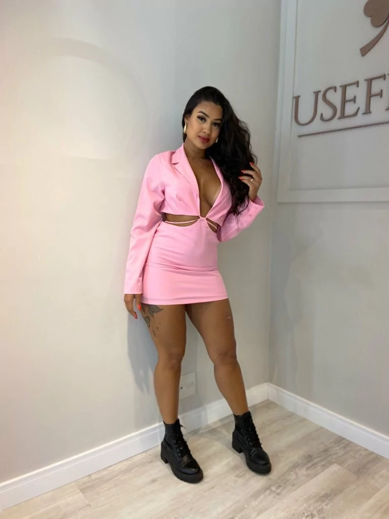 VESTIDO CURTO DE MANGA LONGA COM GOLA CAMISA, DECOTE PROFUNDO E AMARRAÇÃO NA CINTURA. COMPOSIÇÃO: 96% poliéster 4 % Elastano Forro: 100% Poliéster
