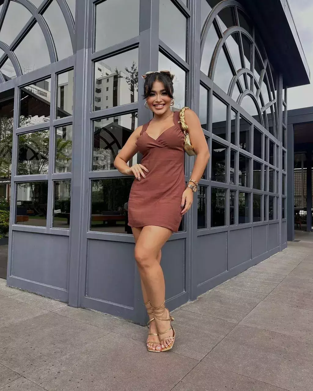 Vestido curto de manga longa com decote profundo, saia transpassada e abertura nas costas. Composição: 95% Poliéster 05% Elastano Forro: 100% Poliéster
