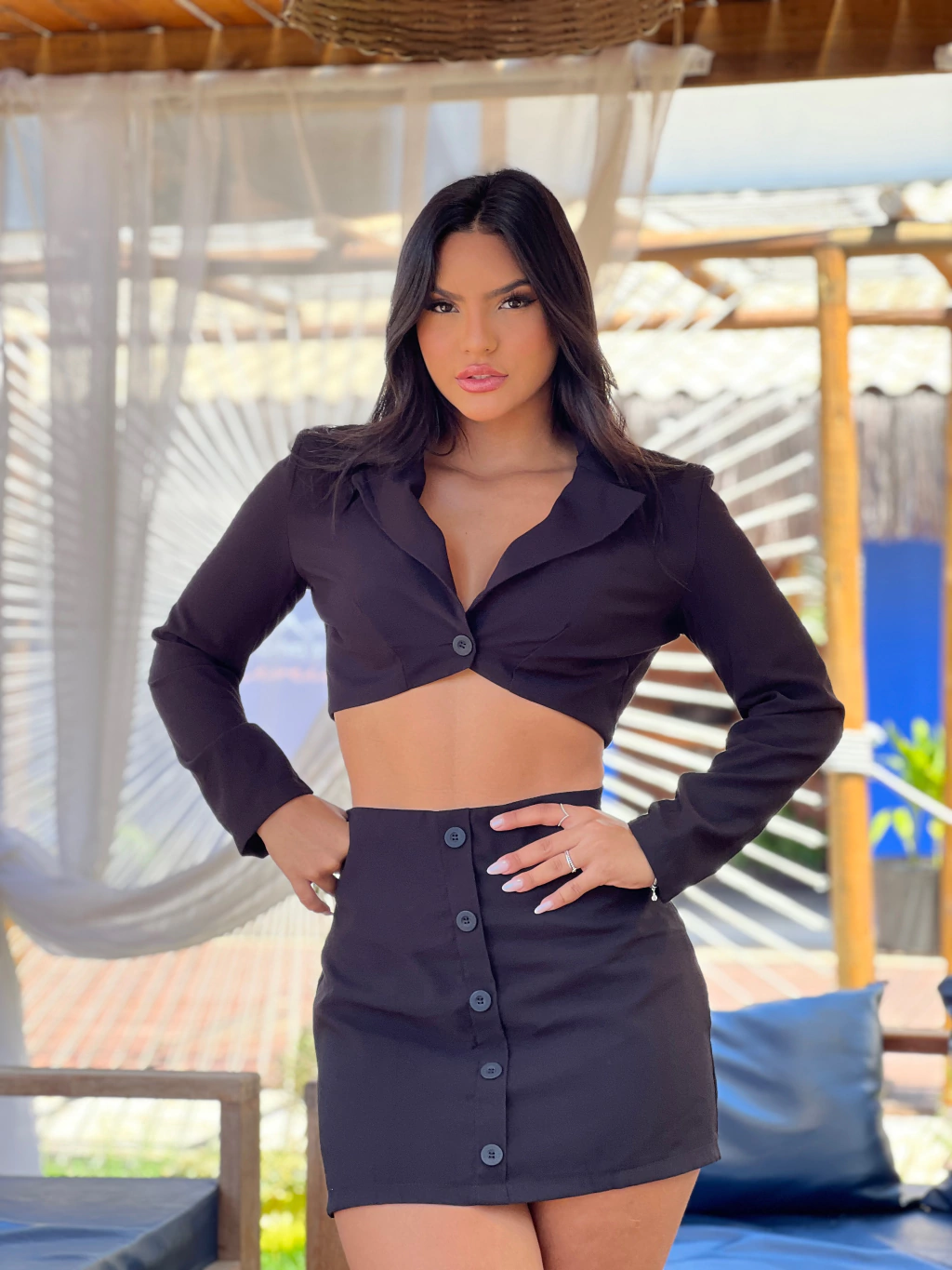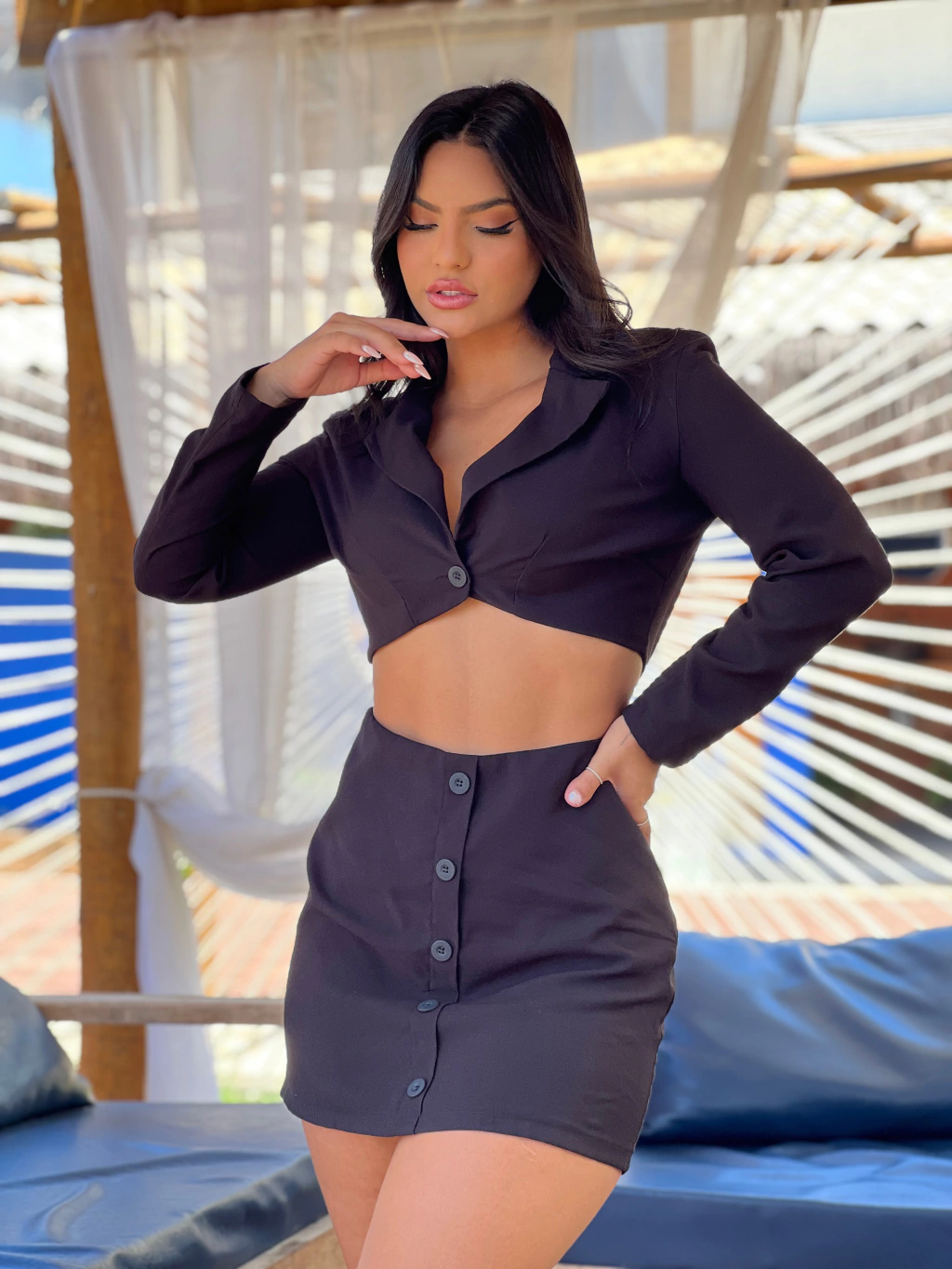 VESTIDO SOFIA EM ALFAIATARIA COM OMBREIRA E DETALHE DE BOTÕES NA SAIA. SAIA COM ZÍPER