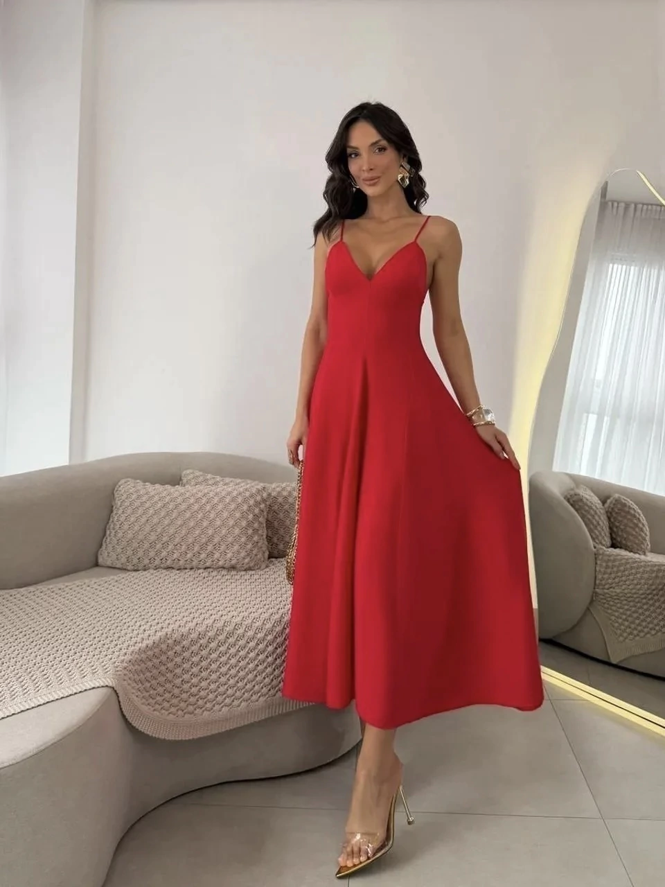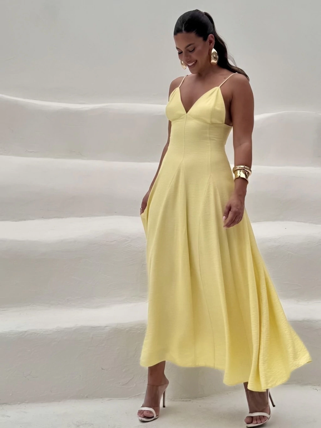 Descubra o charme do vestido midi Thalia, disponível em amarelo manteiga e vermelho vibrante. Confeccionado em tecido de alfaiataria 100% poliéster, com forro também em poliéster, garante caimento fluido e confortável, especialmente na barra, que traz movimento e sofisticação.